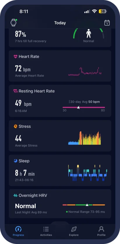 高驰手表可记录你的睡眠数据、HRV,帮助你判断身体是否休息充分。