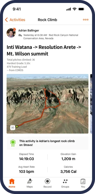 配备双频全星座定位系统、针对岩壁环境专门设计的独家 GPS 定位算法,COROS 手表在攀岩时能为你提供精准定位。
