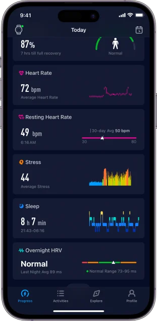 运动训练只是提升体能的一部分。通过详细的睡眠监测、HRV、健康快测等功能,可帮助了解身体恢复情况,降低受伤风险。